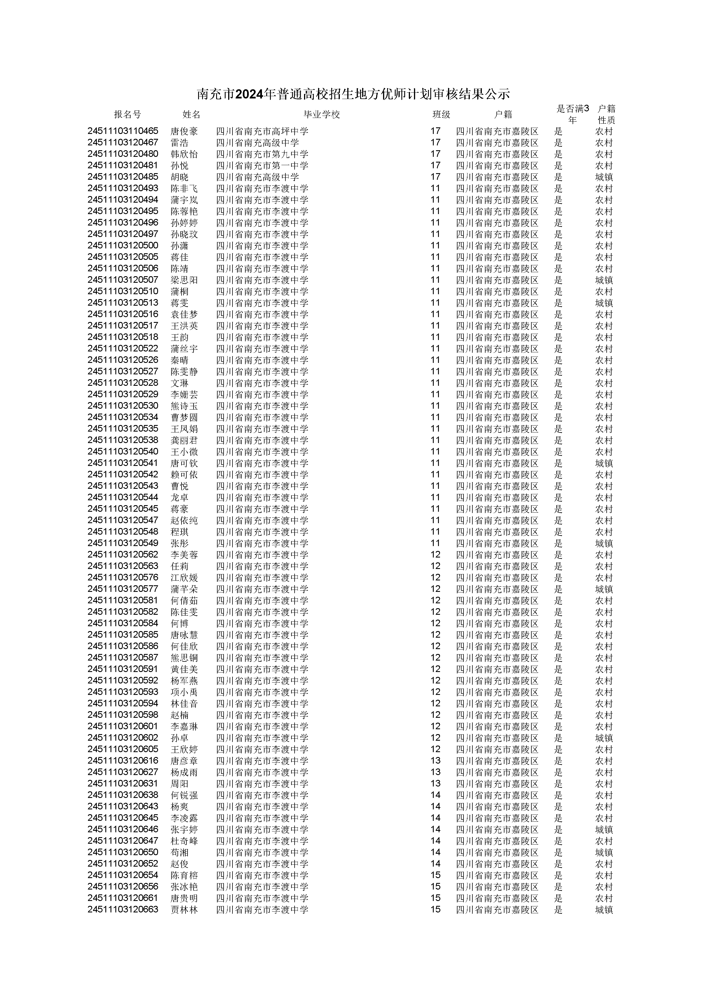 南充市2024年普通高校招生地方优师计划审核结果公示
