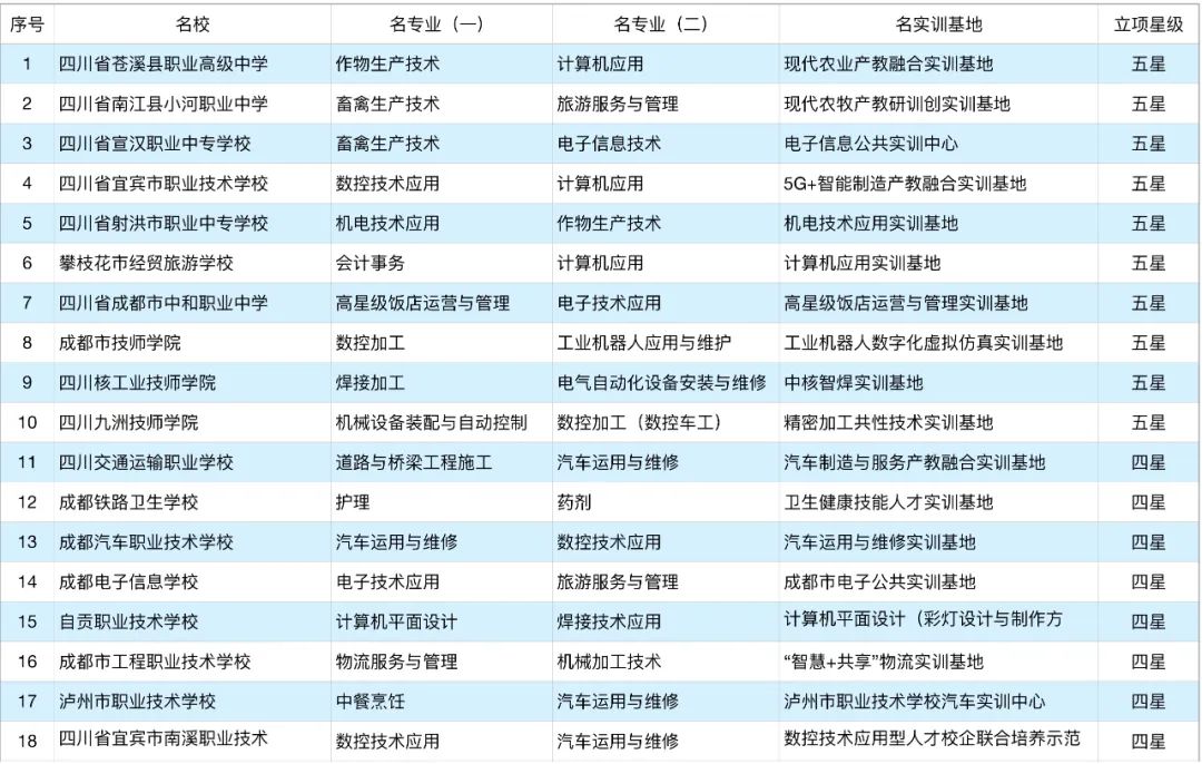 近日,教育厅、人力资源社会保障厅、财政厅印发《关于公布四川省中等职业教育名校名专业名实训基地建设工程立项建设名单和开展项目建设工作的通知》(以下简称《通知》),公布了我省首批立项建设的90所中等职业教育名学校、180个名专业和90个名实训基地名单。